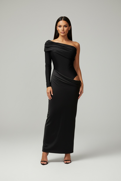 Long Satin Dress with Sculpted Bodysuit and Cut Details